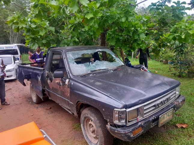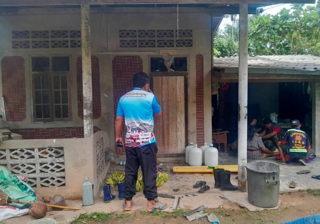 Police arrived at the scene and found Surapong lying face down in a pool of blood,with debris and shrapnel scattered across the yard.