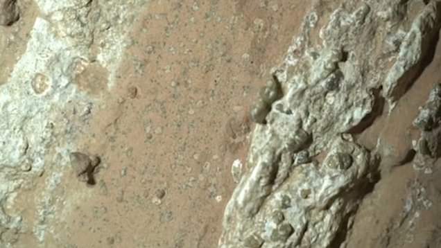 The 350billion-year-old mudstone,named Cheyava Falls,is covered in specks a few thousandths of an inch wide that contain two minerals.
