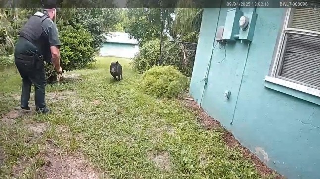 A wild boar charged at a sheriff’s deputy holding rope and trying to lasso it (Picture: Jam Press/Lee County’s Sheriffs Office)