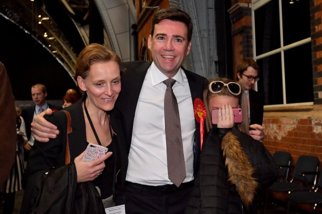 Labour’s Andy Burnham celebrates winning the Greater Manchester mayoral election with wife Marie-France van Heel (L) and daughter Annie (Picture: Getty)He lives in Warrington with his wife,Marie-France van Heel (who is Dutch),his won and two daughters. Burnham and his wife have been together since university.