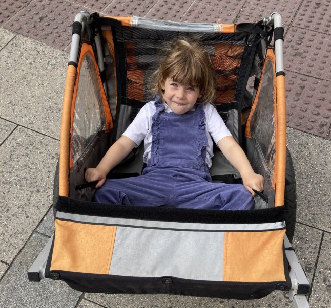 The trailer’s a wide buggy-shaped seat (Picture: Dani Diaper)