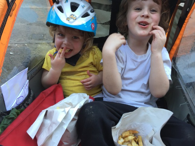 Gruff and Marnie – who were five and two years old at the time – were happily cruising along with me in a trailer attached to my bike,which is essentially a wide buggy-shaped seat,enclosed by a metal frame,weather-proof cover and a big flag to alert drivers.