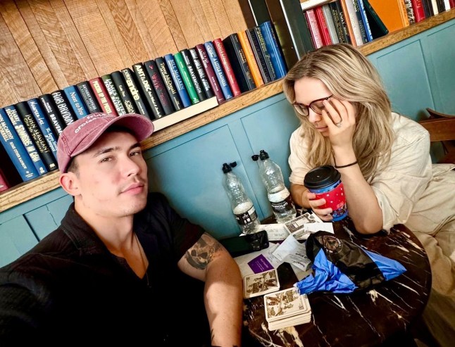 Kaya and her civil servant husband Mike tried to kill time in a cafe after mistakenly being told to arrive to the airport again before 6am (Picture: Kaya Cheshire)