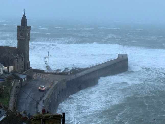 A solitary car braves the storm in Porthleven (Picture: James Kitto)‘I went out about 4.30pm and the size of the waves coming in towards the port,they were huge,absolutely huge.‘I didn’t get the warning through on my phone and I had family and friends calling me not take and any risks,which I won’t.’Asked how he will be spending the evening,he said: ‘I am going to bunker down indoors. The wind is just getting stronger and stronger. I just had to tie down my wheelie bin. Being killed by a council wheelie bin has to be up there as one of the worst ways to die.Opening his front door to the whistling wind,he urged others: ‘Stay indoors stay safe you never know what the wind can do,it could pull tiles down from roofs and get really dangerous out there. It is wild.’