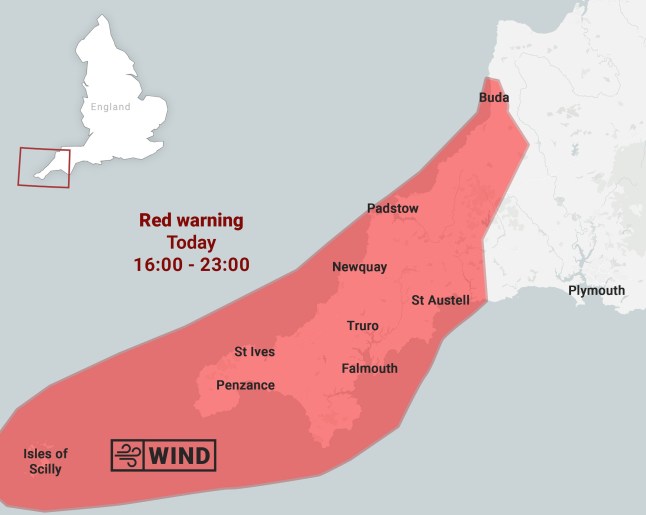 A red weather warning for Cornwall has been issued by the Met Office due to Storm Goretti (Picture: Datawrapper)He added: ‘It is as bad as I have seen for years. We had one enormous storm where the baulks – the timber beams that protect the inner harbor were broken like matchsticks. We are famous for our storms round here.’Nai Lou,a local to the area,told Metro: ‘Crazy down here,apparently all roads into Porthleven are blocked with large fallen trees and debris.‘My other half can’t get home and my eight-year-old is really scared.‘I opened the door about an hour ago and even though there were no other doors or windows open,the draft blew some internal doors open.‘I’ve never known anything like it.’The owner of The Ship Inn told Metro: ‘It’s real bad,there have been reports of the waves being a hundred foot offshore.‘We’ve all had to close down. The staff have all had to go home.