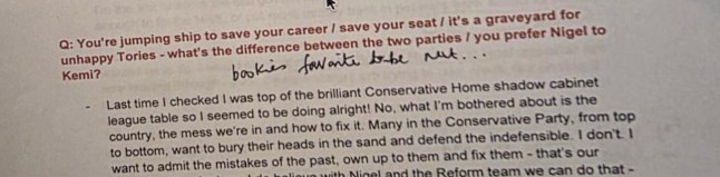 The media briefing has handwritten notes on itOne line from the six-page media advice read: ‘You’re the new sheriff in town,here to provide experience and political heft to Reform’s operation so the country can be fixed.It continued: ‘You’re the biggest defection story Reform has ever had (and likely ever will).‘The most popular Tory shadow cabinet member,leader in waiting if Kemi ever fails,and the most dynamic politician in the Conservative party.’The plan also listed questions which appeared to be in preparation for any press conference after a defection to Reform.Prefer us to the others? Then tell Google!