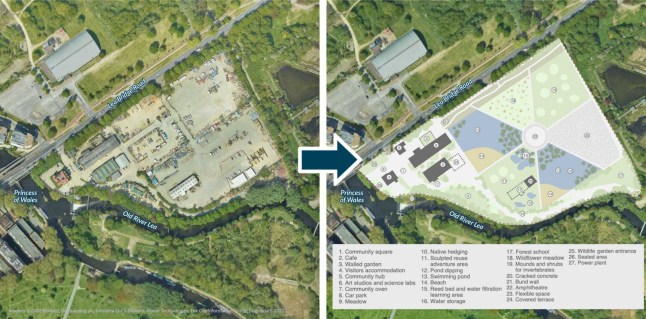 The Thames Water depot on Lea Bridge Road in Waltham Forest would beturned into a ‘community-owned,biodiverse park with wild swimming ponds and community spaces.’