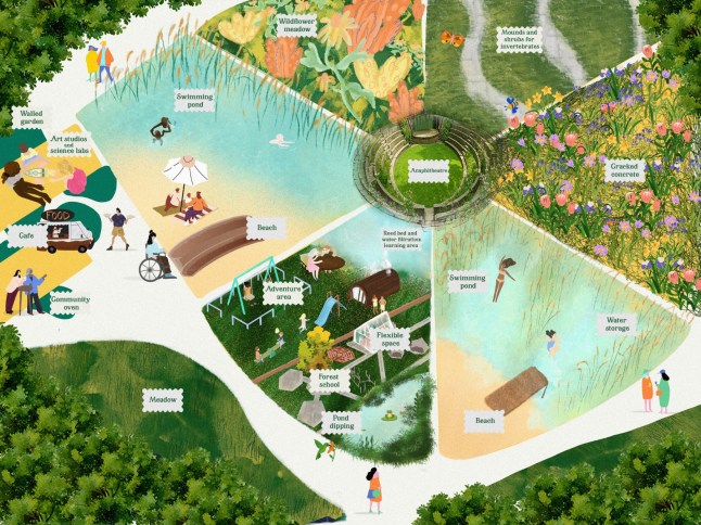 Artist’s rendition of what the proposed naturally filtered swimming ponds could look like near the Walthamstow Wetlands in East London (Picture: Chloe Mann/ East London Waterworks)