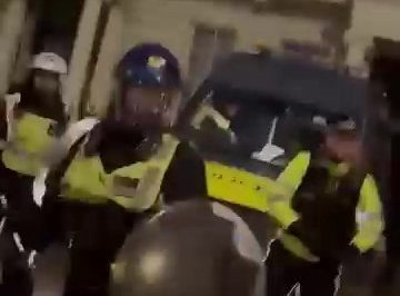 Metro has obtained footage of police officers in riot gear holding batons and shields,swinging at protesters to force them back behind metal railings.