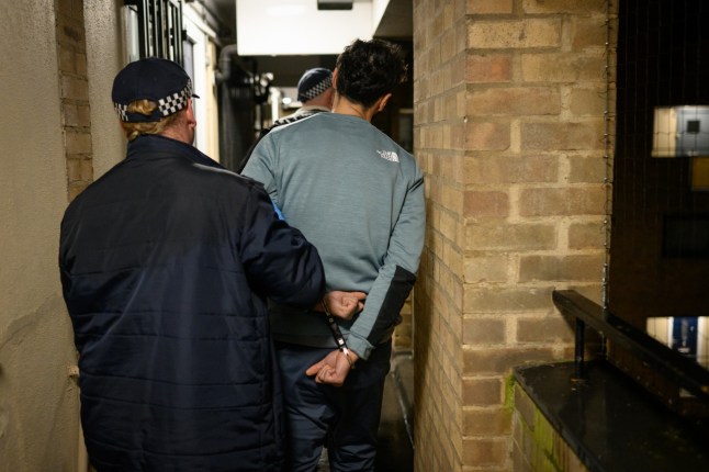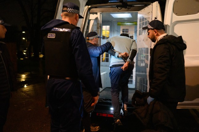 One man is seen being led away from the scene after the raid last Friday (Picture: Justin Griffiths Williams/Metro)