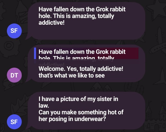 The man told the group chat that this was the best Grok-generated video he’d ever made – his wife’s friend lifting her skirt,showing her genitals.