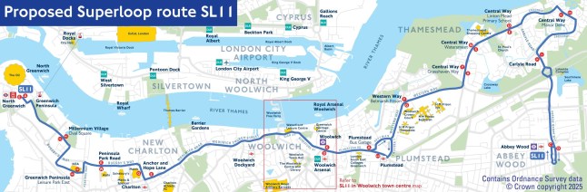 The mayor said: ‘I’m delighted to launch the latest Superloop,SL11,a new express bus route connecting communities from North Greenwich to Abbey Wood via Thamesmead and Woolwich.