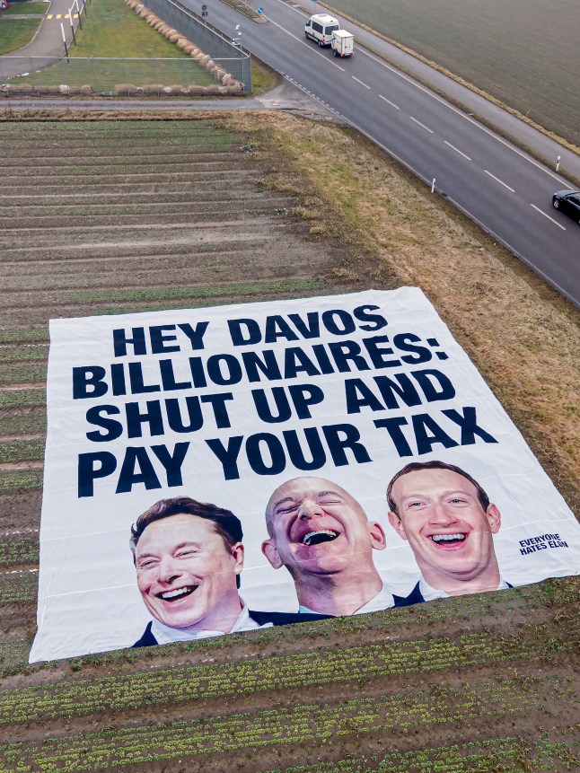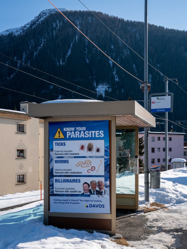 Bus stops have also been the target of Everyone Hates Elon,with adverts popping up around the picturesque town (Picture: Everyone Hates Elon)Featuring pictures of Elon Musk,Jeff Bezos and Mark Zuckerberg,the banner read: ‘Hey Davos billionaires: shut up and pay your tax.’Jason told me: ‘We wanted them to realise that they’re going to be kind of quaffing champagne and spending a few days talking about solutions,when the real solution is staring them in the face.‘If they actually just go up and pay their tax,then,you know,that is the solution.‘That’s how we counter poverty around the world. That’s how we solve some of our biggest challenges. That’s how we tackle climate change.’The group has also ‘hacked’ a bus stop ad in the town to read ‘Know your parasites: ticks,worms,billionaires’.That one,of course,is more for the locals rather than the private jet class.United News - unews.co.za