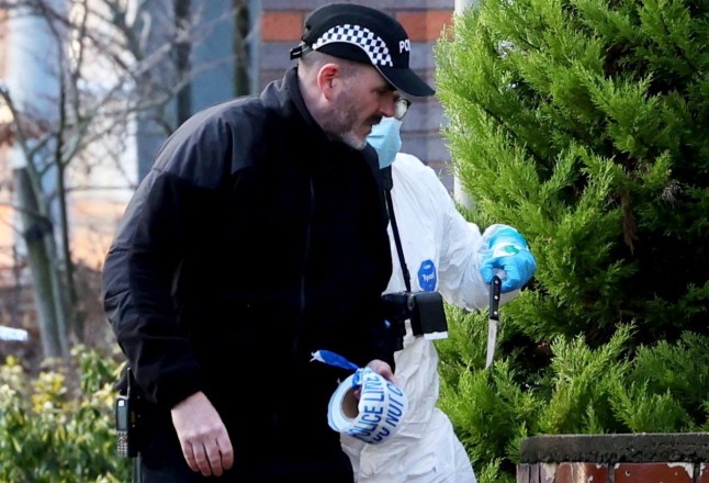 A knife that was seen in bushes on Grange Lane,Leicester,is removed by forensic officers (Picture: Anita Maric / SWNS)