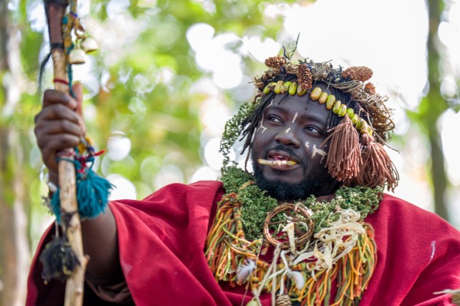 Kofi Offeh aka ‘King Atehene’ is one of three self-styled ‘African tribe’ members camping in woods near Jedburgh (Picture: Barlow/PA Wire)