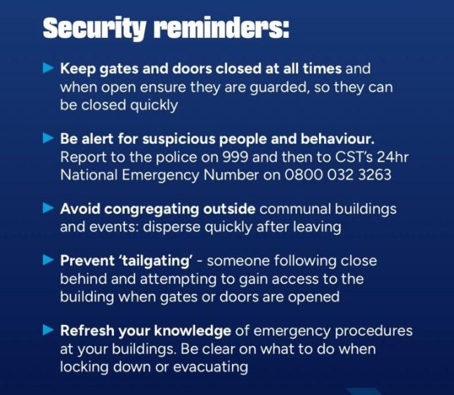 ‘Security measures across the Jewish community have been at a very high level since the October 7th terrorist attack in Israel,and in light of the attack on Heaton Park Synagogue and the ongoing terrorist threat to the Jewish community here in the UK.’