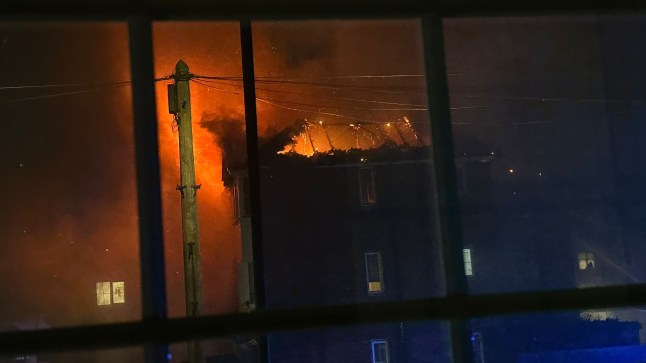 Horrifying images appear to show people trapped by their windows as flames rip through the roof of the block.