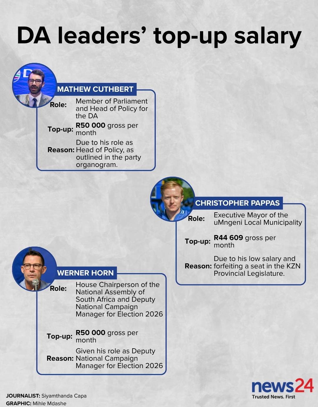 Mathew Cuthbert MP and DA head of policy – R50 000 gross per month.