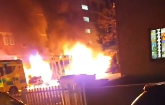 Footage shared on social media shows three hooded figures walking towards the parked ambulances before flames erupt from the site.