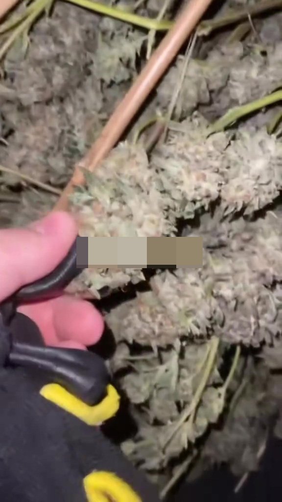 The clip shows a bewildered-looking man in shorts and a T-shirt who apparently lives or works in the house being intimidated by the gang. The camera focuses on the raiders clutching cannabis plants.