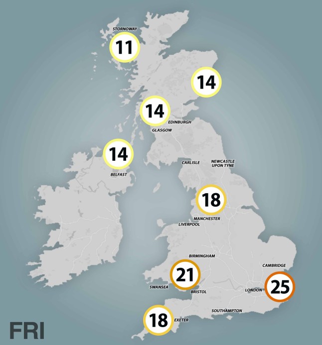 On Sunday,temperatures will fall to as low as 9C in Scotland,10/11C in northern England and Northern Ireland and 12/13 in the south east- just below average for this time of year.