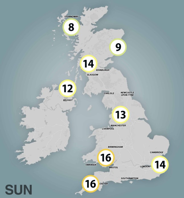 The warmest parts of the UK on Sunday,according to Met Office predictions,will be Wales and the south west,where temperatures are expected to reach 16C.