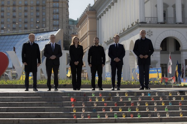 (From L) Poland’s prime minister Donald Tusk,Ukraine’s president Volodymyr Zelensky,Britain’s prime minister Keir Starmer,France’s president Emmanuel Macron,Olena Zelenska and Germany’s chancellor Friedrich Merz pay their respects to the victims of war (Picture: AFP)
