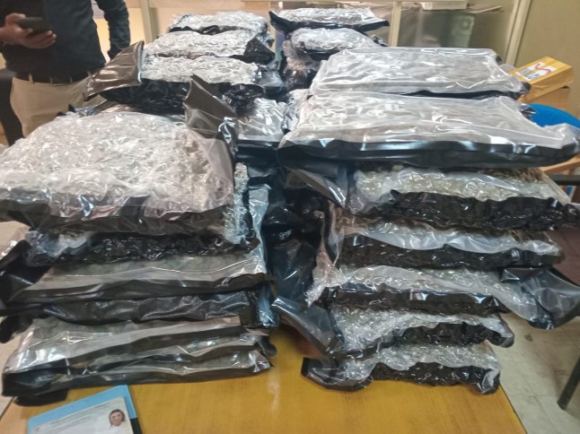 The other photos show the large amount of Kush – a synthetic form of cannabis – found in two black suitcases.