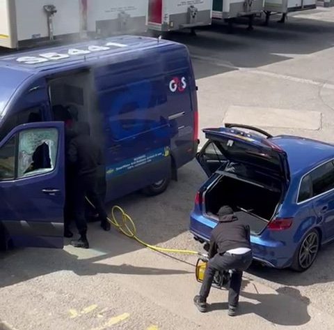 Footage of the raid,which happened earlier this month at the Reevesland Industrial Estate in Newport,South Wales,shows three robbers throwing packages into the back of a blue Audi.
