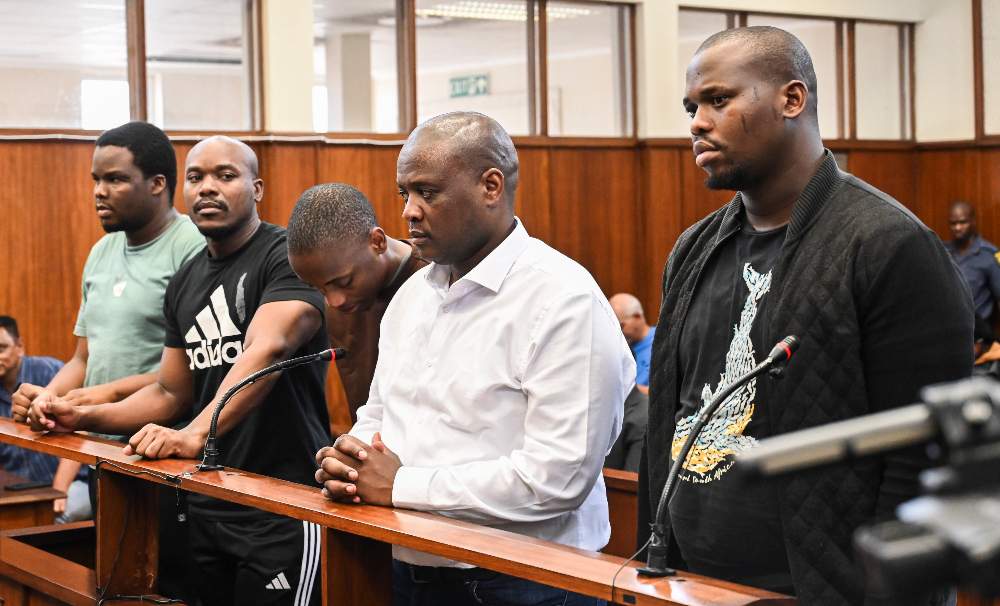 From left to right: Lindokuhle Thabani Mkhwanazi,Lindani Zenzele Ndimande,Siyanda Eddie Myeza,Mziwethemba Harvey Gwabeni and Lindokuhle Lindo Ndimande during their bail application in the Kiernan “AKA” Forbes and Tebello “Tibz” Motsoane murder case in the Durban Magistrate’s Court.