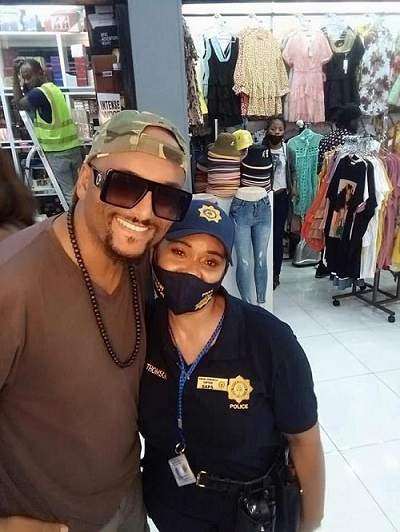 “Khosi Thomson” poses for a picture at a store while pretending to be a cop.