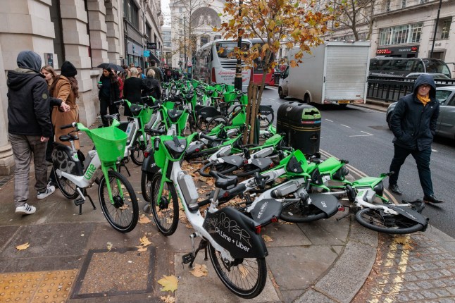 E-bikes seen scattered on the pavement in central London (Picture: In Pictures/Getty Images)