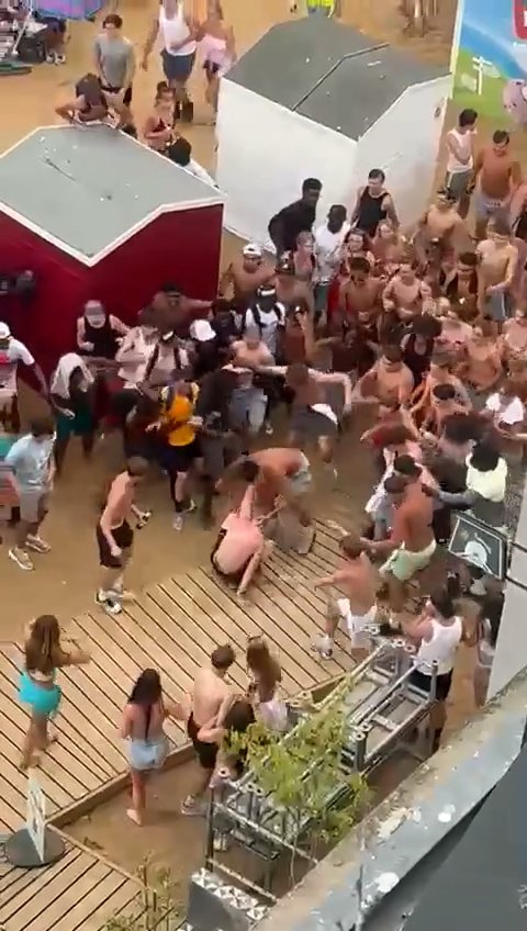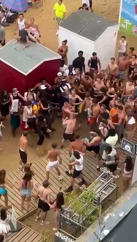 Some of the crowd can be seen climbing on nearby beach huts to get a better view of the fight,while others took selfies and egged on the brawlers.