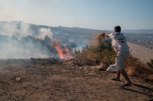 A man attempting to fight a fire in shrubland on the outskirts of Izmir (Picture: Shutterstock)