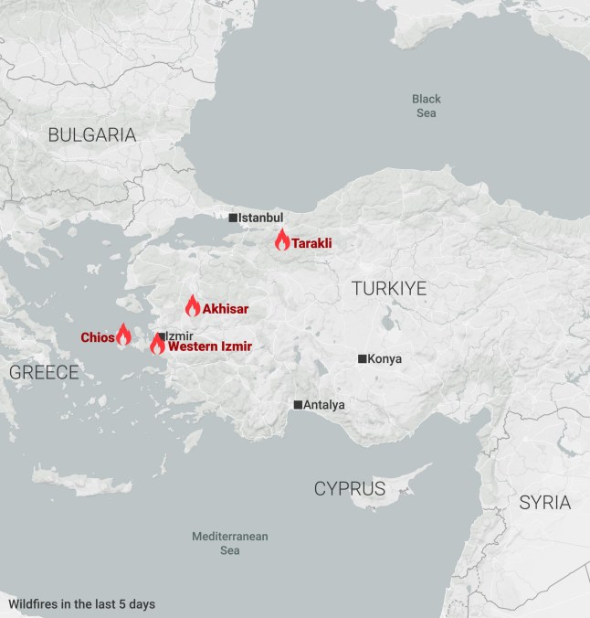 Map shows where the biggest wildfires have struck in Turkey over the past five days (Picture: Metro)