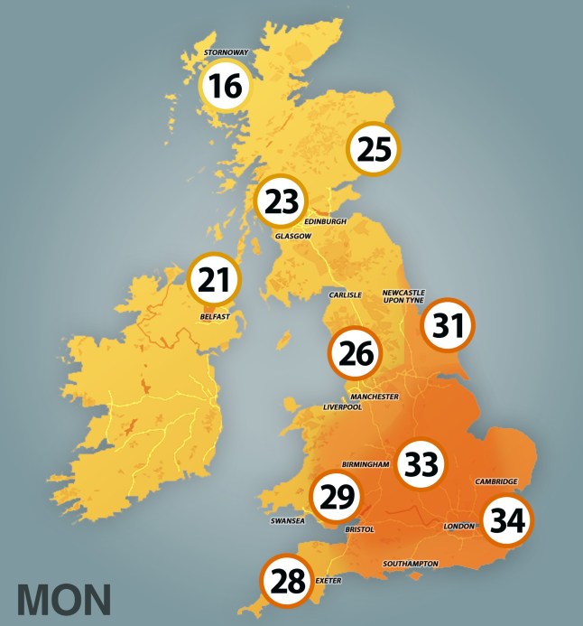 Parts of south-east England could then hit 35°C on Tuesday. But Scotland and Northern Ireland face heavy rain and cooler temperatures.