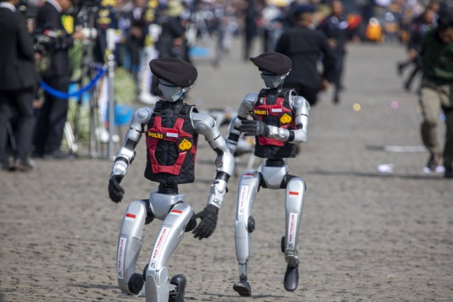 Police officers control humanoid and K9 robots during a showmarking the 79th anniversary of Indonesian National Police (Picture: AP Photo/Tatan Syuflana)