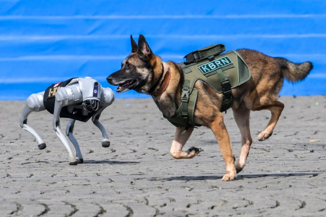 A robotic police dog and a K9 police dog work together in a skill demonstration (Picture: BAY ISMOYO / AFP)