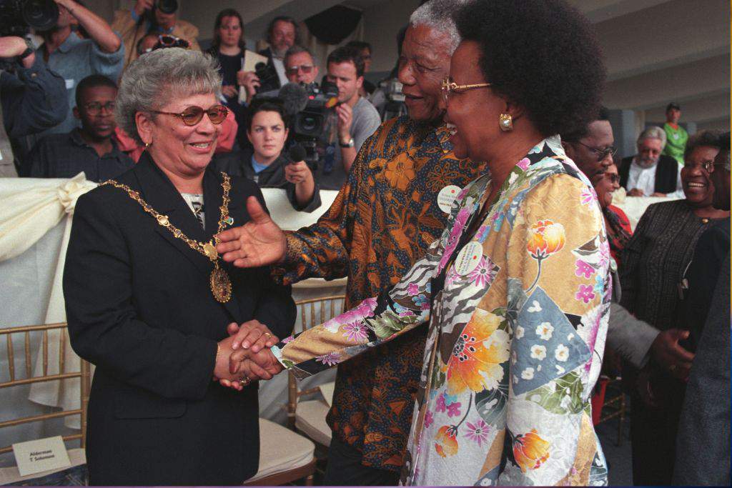 Former mayor Theresa Solomon (left) with Nelson Mandela and Graca Machel.