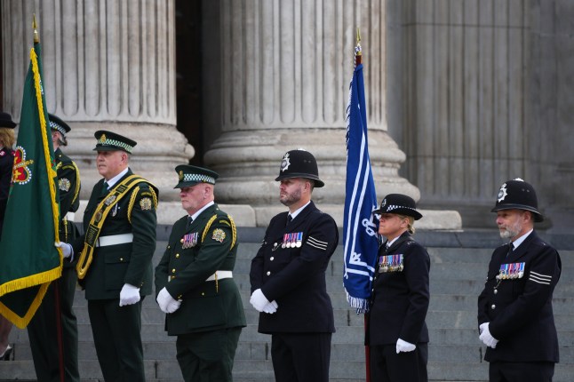 Representatives of the London Ambulance Service and Metropolitan Police lined the steps at St Paul’s Cathedral this morning (Picture: Getty Images)