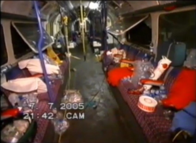 Inside the train Sudhesh was on shows the bomb damage to the neighbouring carriage where the suicide bomber struck (Picture: Gavin Rodgers/REX/Shutterstock)