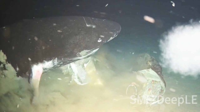 Pacific sleeper sharks have been captured feeding on the ocean floor in a rare sighting in the South China Sea (Picture: Ocean-Land-Atmosphere Research)