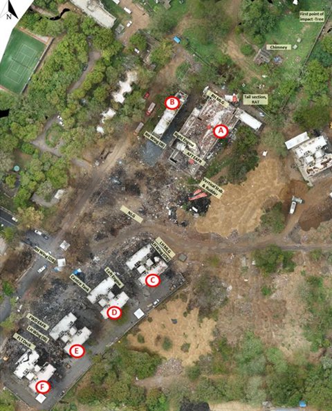 An aerial view of the crash site. Investigators are now focussing on the fuel control switch and its mystery deployment seconds after takeoff (Picture: Government of India/Ministry of Civil Aviation/Aircraft Accident Investigation Bureau)