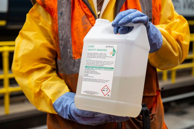 Graffiti cannot be removed by car wash-style machines,but it has to be scrubbed off using a strong chemical (Picture: Lucy Young)