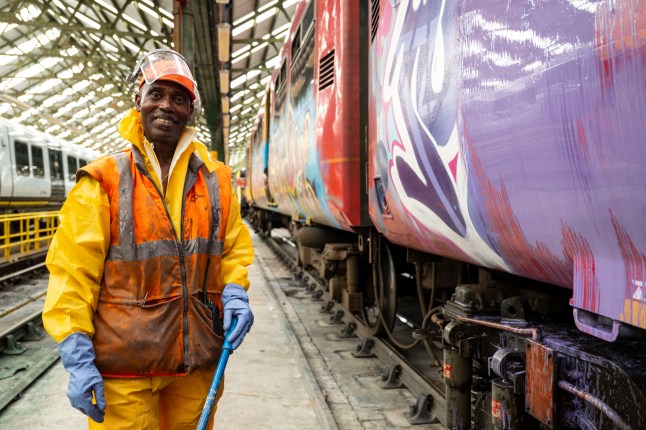 Jeff Asiedu scrubs pesky graffiti off a South Western Railway train in a heatwave (Picture: Lucy Young)