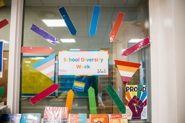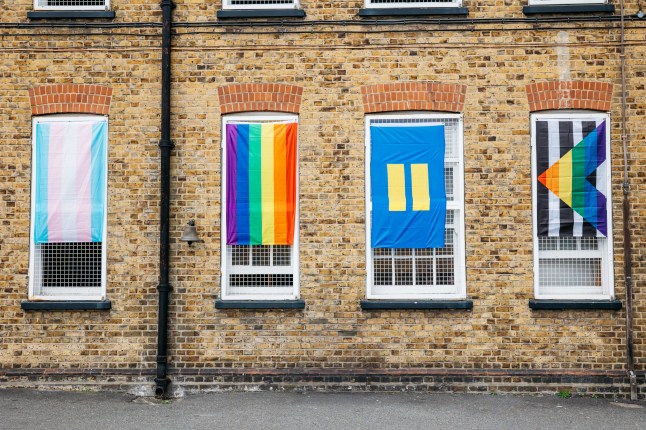 A trans Pride flag,an LGBTQ+ Pride flag,the flag of the Human Rights Foundation and a Straight Ally flag hanging on the school (Picture: Just Like Us)