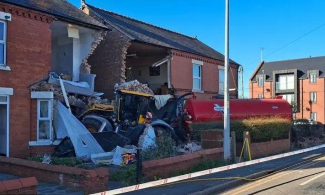 A JCB tractor which crashed into a house after being hit by a car (Picture: Chester Police/PA Wire)
