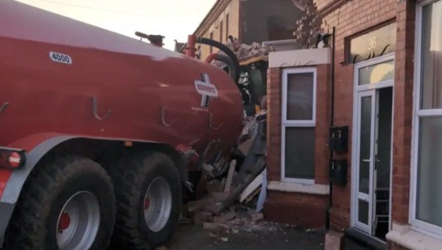 A 31-ton tractor full of animal waste smashed through a row of terraced houses after a drug driver sped through a red light and collided with the farming vehicle.