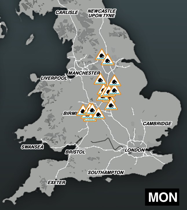 The Environment Agency has issued 18 flood alerts – which means floods ‘are possible’ – for parts of the midlands,Nottinghamshire,Derbyshire and Yorkshire,among other areas.