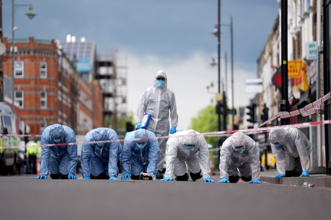Police forensic officers on Kingsland High Street,Hackney,east London,near to the scene (Picture: PA)